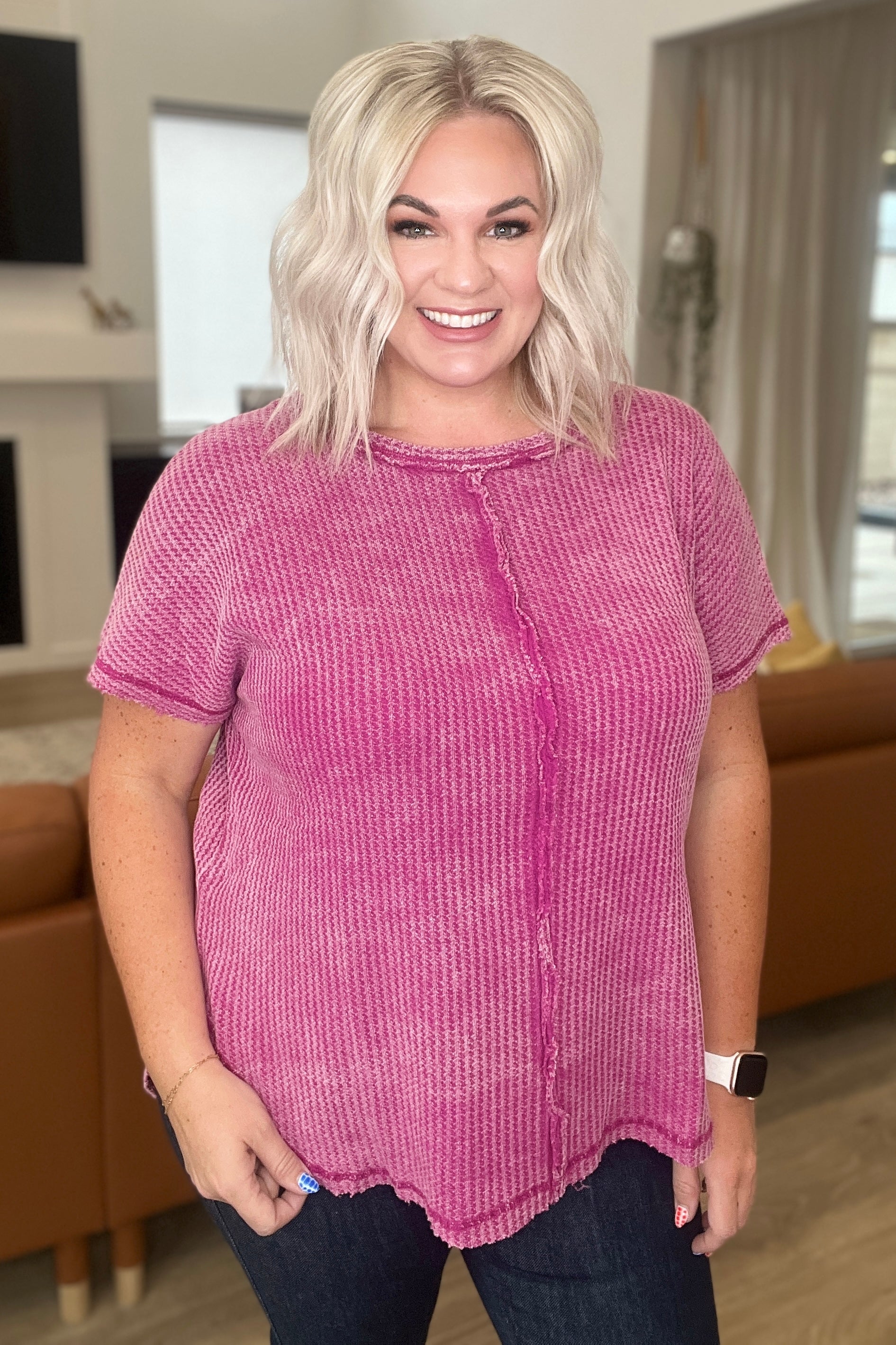 Transform your wardrobe for spring with the A Wink and a Smile Waffle Knit Top. Featuring raw edge details, a round hem, dolman sleeves, and a unique back patch detail, this mineral-washed piece adds unique character to any look.